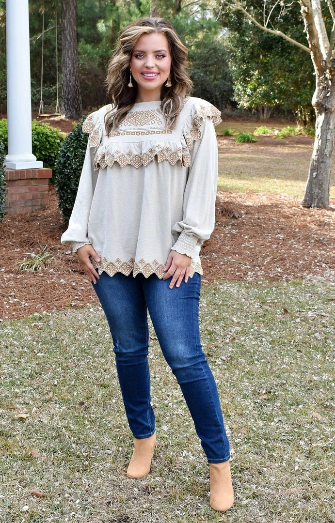 This embroidered top is begging to be added to your closet this season! We love the cream background with embroidered detail lining the overlay and trim! This unique top runs true to size with some stretch to the material. Our favorite touch is the shark tooth trim! You are going to love having this top in your closet!