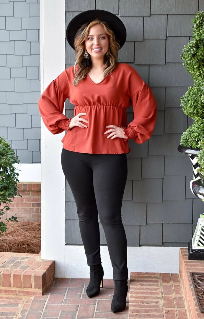 This top is very chic and trendy. The brick color is perfect for fall. The fit is true to size and it’s very comfortable to wear all day.