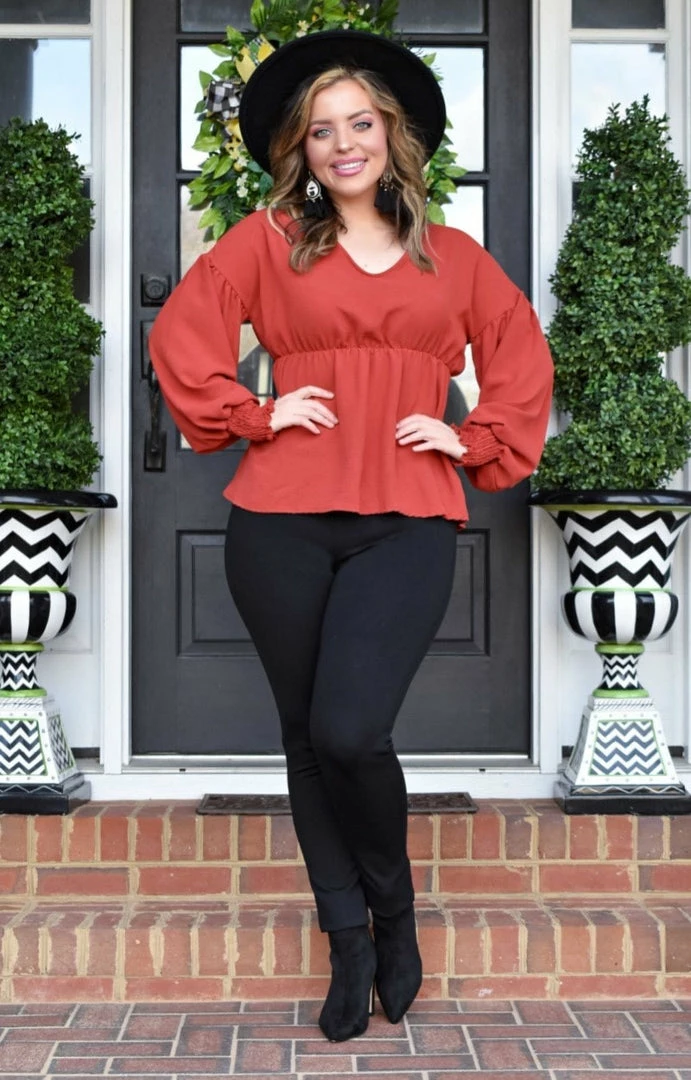 We are obsessed with this little brick top! It features the cutest cut to truly flatter any shape. We love that you can rock this so many different ways with endless pairing options. There is no stretch in the overall material, so if larger in the bust, you may want to size up. The open cut sleeve detailing with the adorable ruched design near the wrist add the cutest pop to this little top. You are going to love this one!