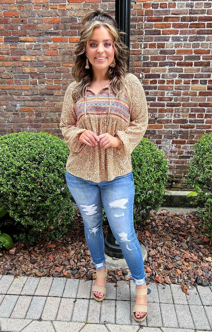 This little print top is just what you need for your next weekend ready look! This one features embroidered detailing along the front with bold colors to make you stand out. This one runs true to size with a flowing cut. Grab yours with your favorite PPB jeans and get ready to turn heads!