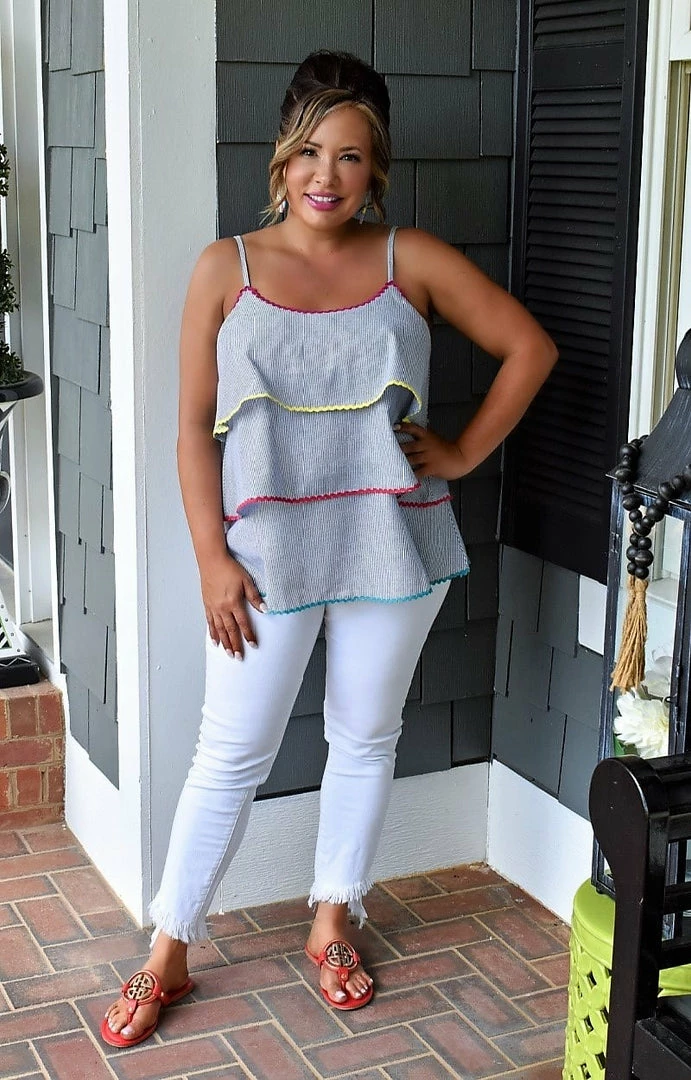 We cannot get over how adorable this little top is! This top features a blue striped design throughout with fabulous pops of colors to set it apart from the rest. The ruffles gives this one such a cute pop of drama and also add a flattering touch to camouflage the midsection. You are going to love rocking this with your favorite PPB accessories this season!