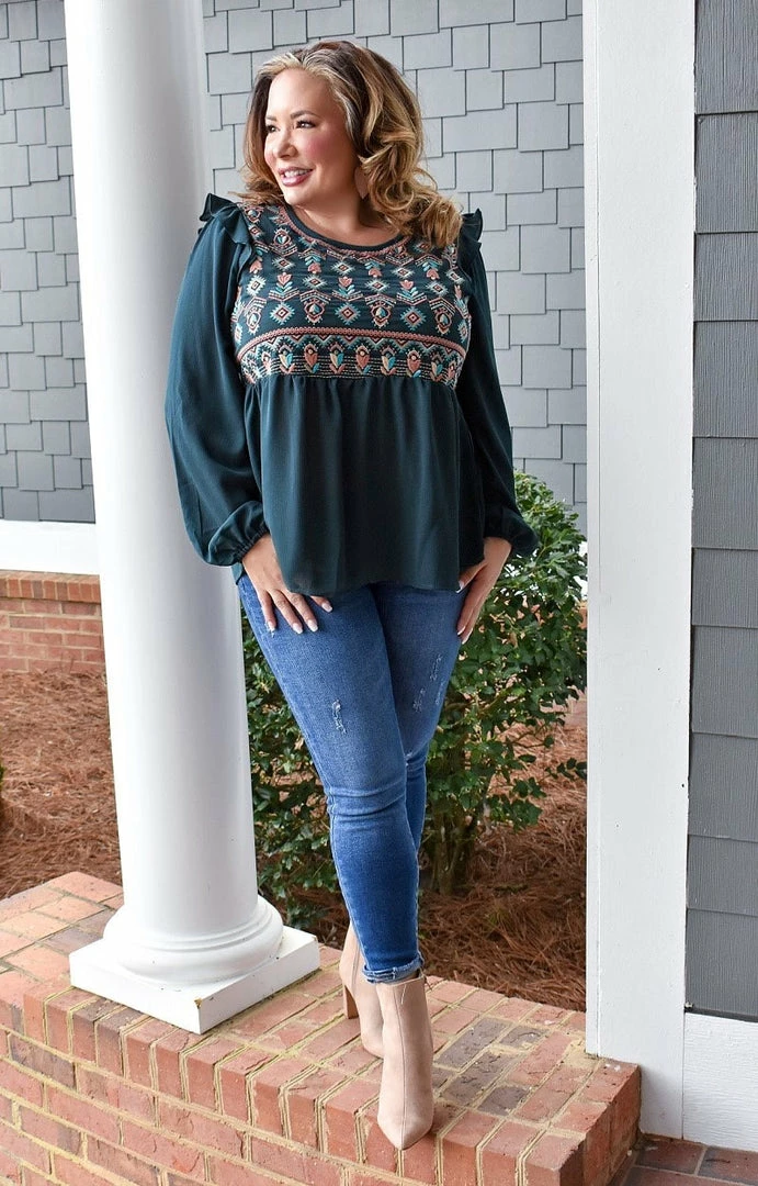 This little hunter green top is just what you need for your next go to look! It features a more flowing design even though there is no stretch in the actual material. The hand embroidered detailing along the front add such a beautiful pop to dress it up even more. The ruffle accents along the shoulders give this one the cutest extra pop. You are going to love this one!