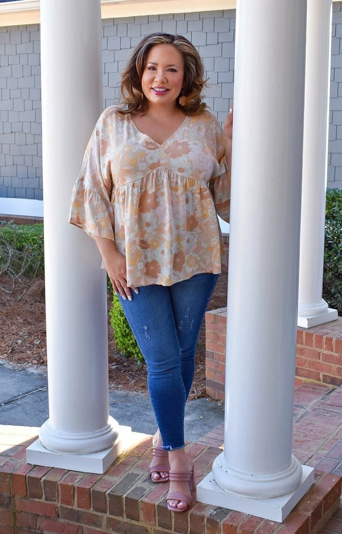 We are obsessed with the soft and dainty color combinations in this floral print top! This one features a v-shaped neckline to flatter and open up the bust area. This beauty defines the waist as it then flows down. The belle sleeve detailing also adds a trendy pop. You need this one!