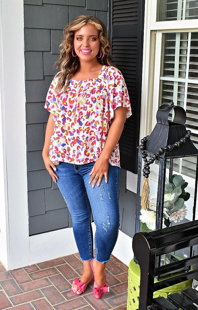 Add a fun bold pop of color to your closet this season with this printed top! This leopard print stunner features a flattering square shaped neckline with open cut sleeves. The back has a tie design that adds a pop of flare as well. With comfort and style in mind, this is sure to be your favorite go to top this season!