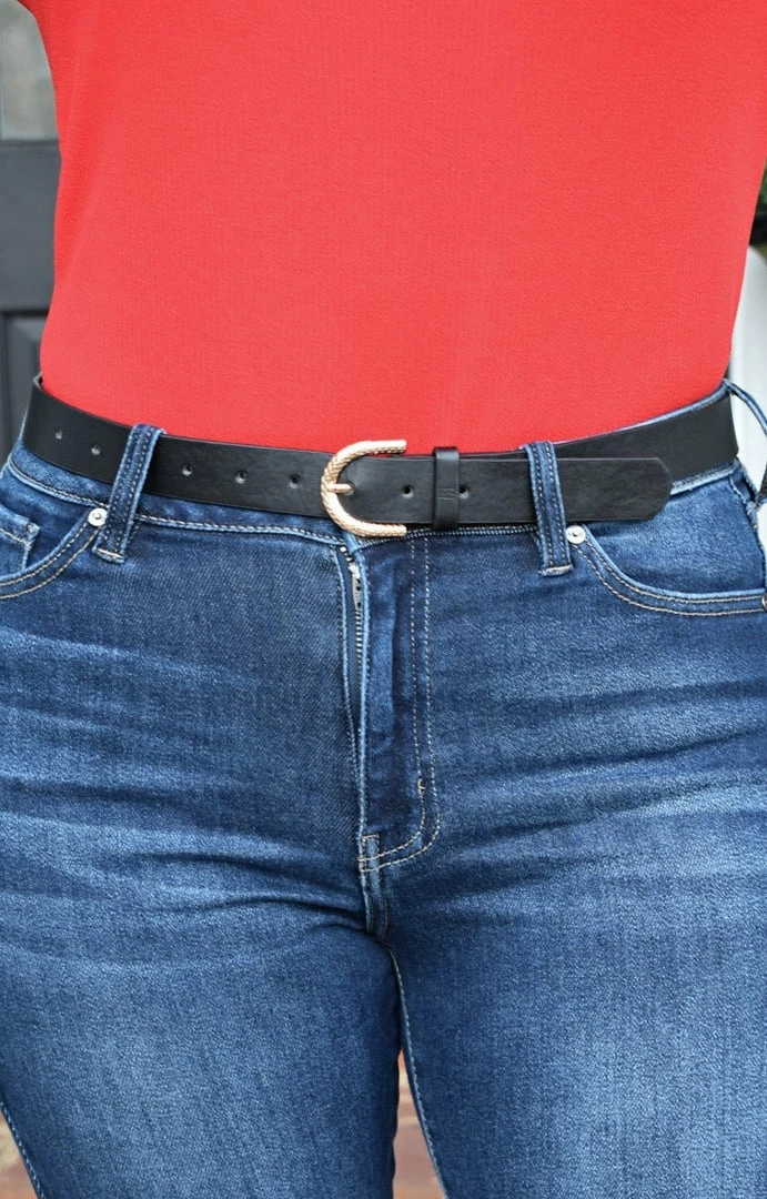This belt pairs perfectly with our new red bodysuit! It features a black color with gold accents. Grab yours and enjoy making your looks stand out in style this season!