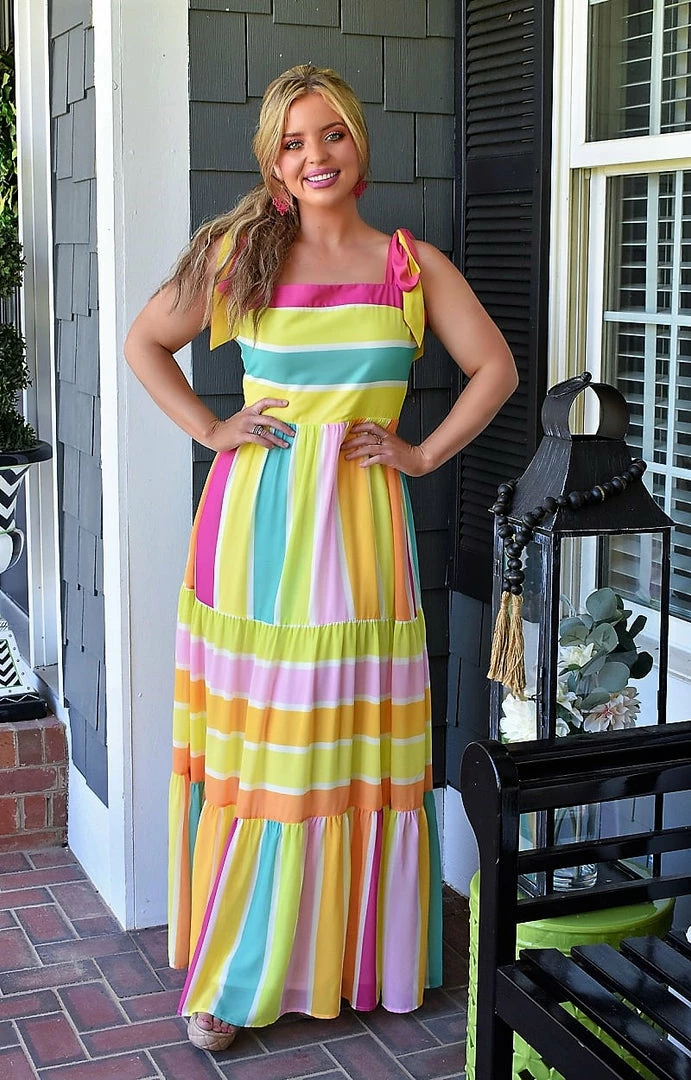 This stunning little print maxi is at the top of our must have list this season! This beauty features a bold and vibrant color combination with a fully lined bodice to flatter your shape. The straps feature a thicker band that tie in the cutest bow to make it pop. You are going to love this the moment you put it on!