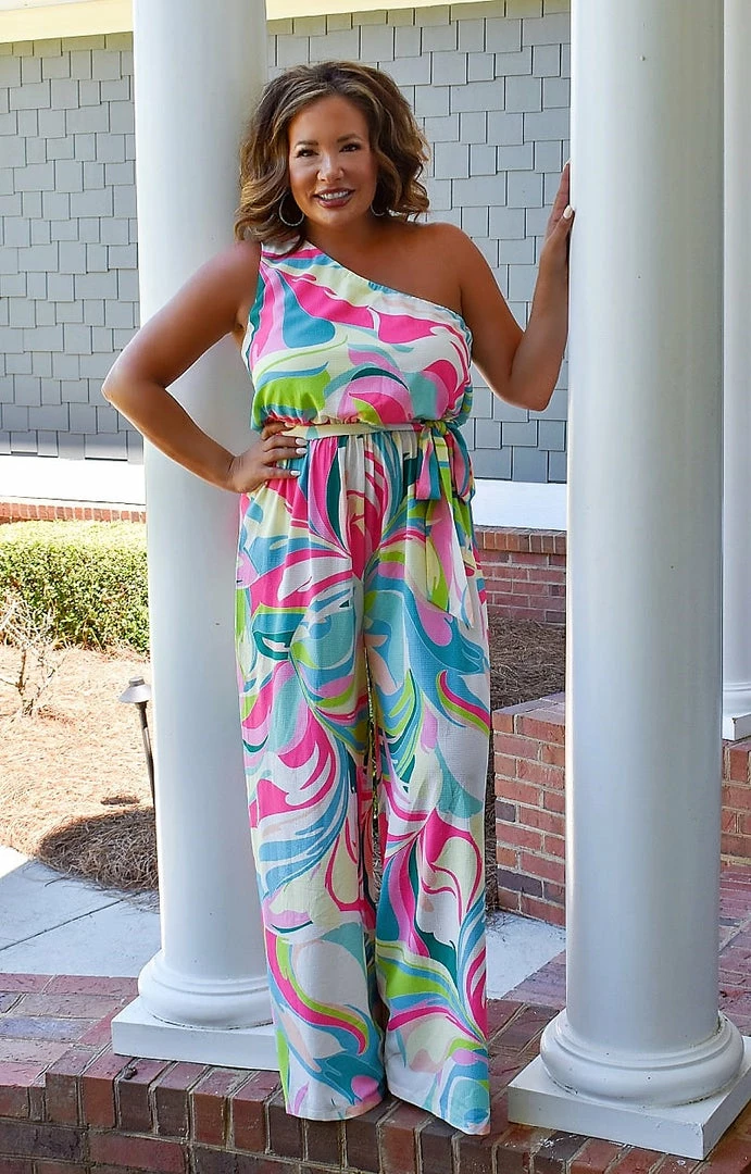 We are swooning over this print jumpsuit that is sure to make you stand out from the rest for all of the right reasons. This beauty features a one shoulder design that adds such a chic pop to this look. It has an elastic style waistband to define the waist to give that flattering look that is sure to turn heads. The pants also feature a more open cut design to elongate and add a fun touch of drama. You are going to love this the moment you put it on!