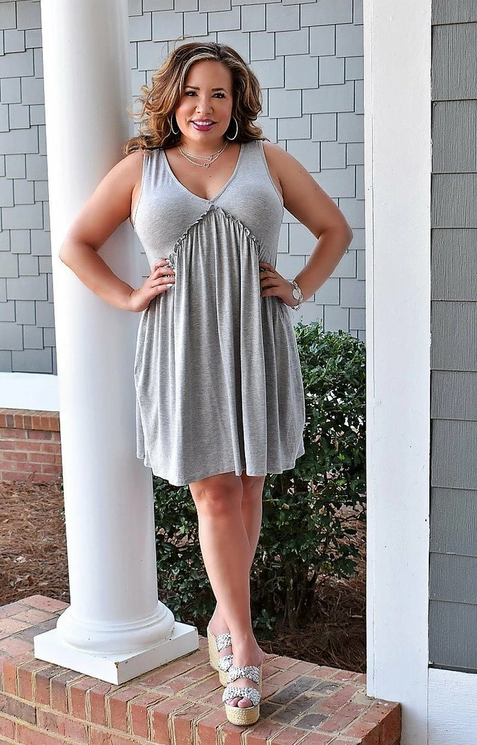 We always love a great go to little solid dress that brings endless pairing options and this one does just that! This heather gray beauty features the softest, most breathable material, a v-shaped neckline which opens up and flatters the bust, and ruffle trimming at the waist. Rock this alone or layer it with your favorite go to kimono/cardigan.