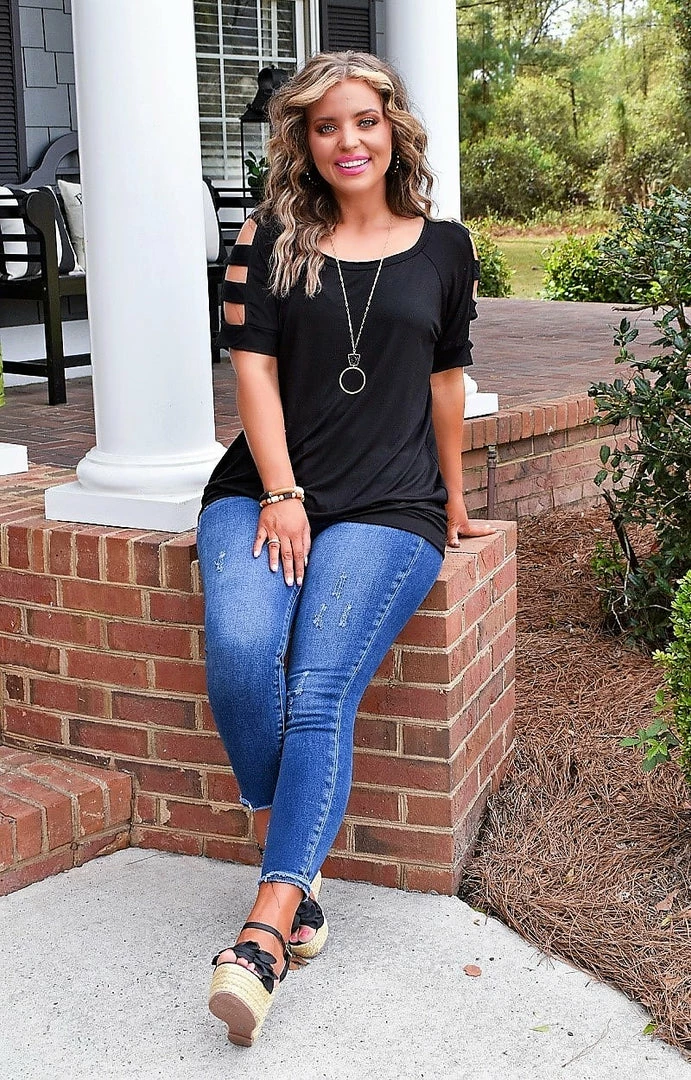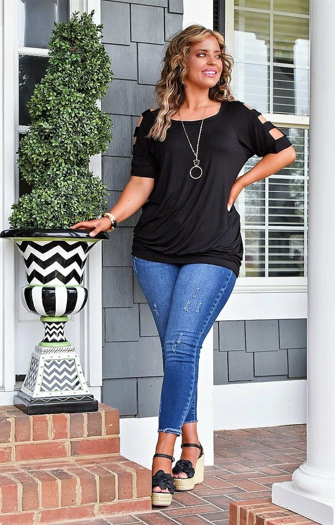 This bold black top is just what you need to take your casual day to the ultimate level of fab this season! This top features a soft and breathable material that is so comfy throughout wear. It features cutout detailing along the upper arm area that truly set this look apart from the rest. The bottom features a banded design that allows for a flattering look to show off your shape. Grab this beautiful top up before it’s gone!