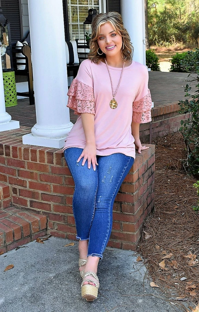 Say hello to your new go-to! We love the solid mauve bodice with the tiered lace layered sleeves truly setting this top apart from the rest! This top runs true to size with stretch to the bodice area. You will love all the styling options this little solid stunner has to offer! Don’t miss out on adding this to your closet!