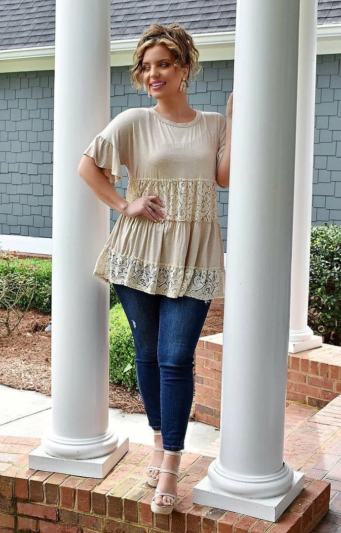 This top is simple, yet so eye catching. It features a neutral taupe color with a flowing design and stretchy material. The lace detailing throughout adds the perfect pop. Throw this on with jeans and statement accessories and get ready to look fab all day!