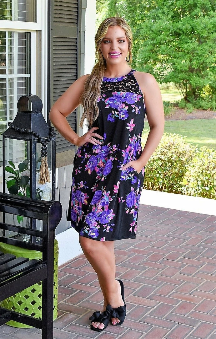 Stay fab in floral no matter where you go rocking this soft and breathable stunner! This one features our famous poly/spandex blend that is hard to wrinkle and so flattering to your shape. It even has pockets! Aside from the stunning floral print design, we also cannot get enough of the lace accents along the front and back that add a stylish pop. You need this one!