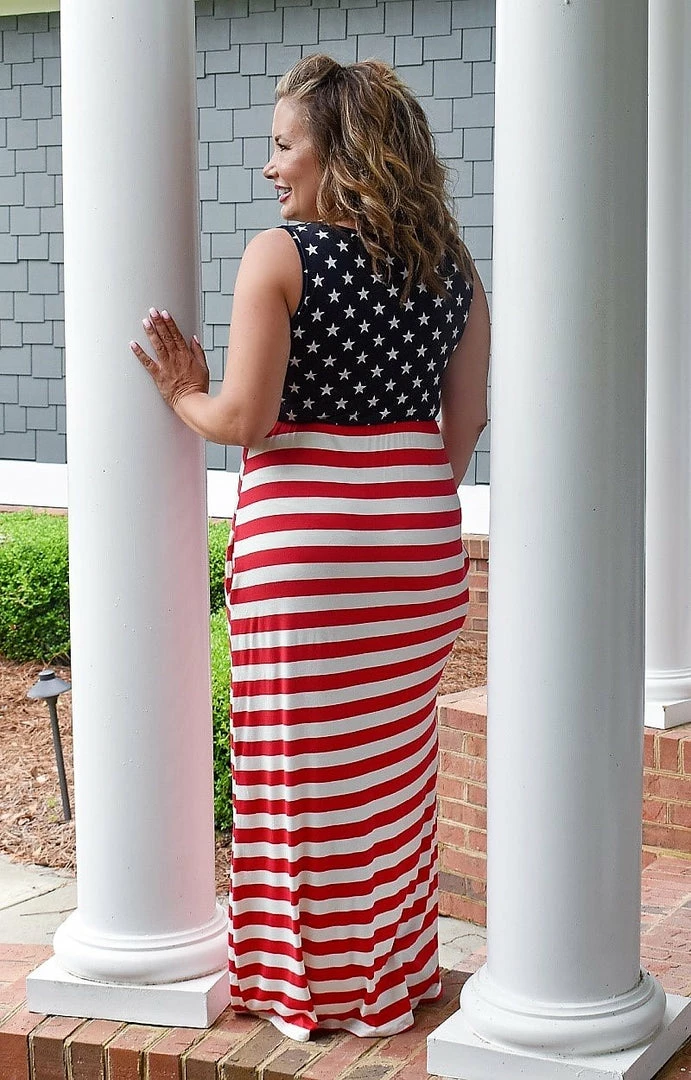 Stay stylish and fab no matter where you go this season in this head turning little maxi dress! This beauty features a contrasting design of stars on top with a bold striped design along the bottom. This one cinches in at the waist and even pockets! This one is so flattering to your shape and sure to make you turn heads no matter where you go!