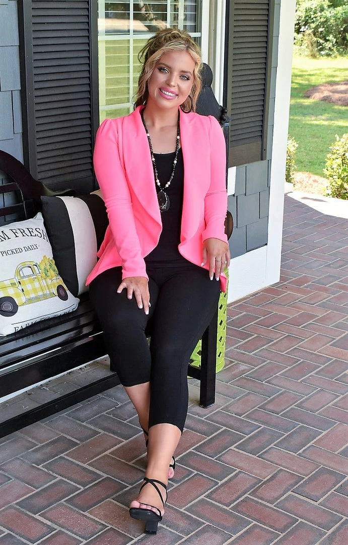 This blazer is absolutely fabulous! Available in multiple colors, this hot pink option may be our fav! This one is bold and vibrant and pairs perfectly with black accessories. We love the stretchy and comfy design of this one as well. You are going to love rocking this multiple ways this season!