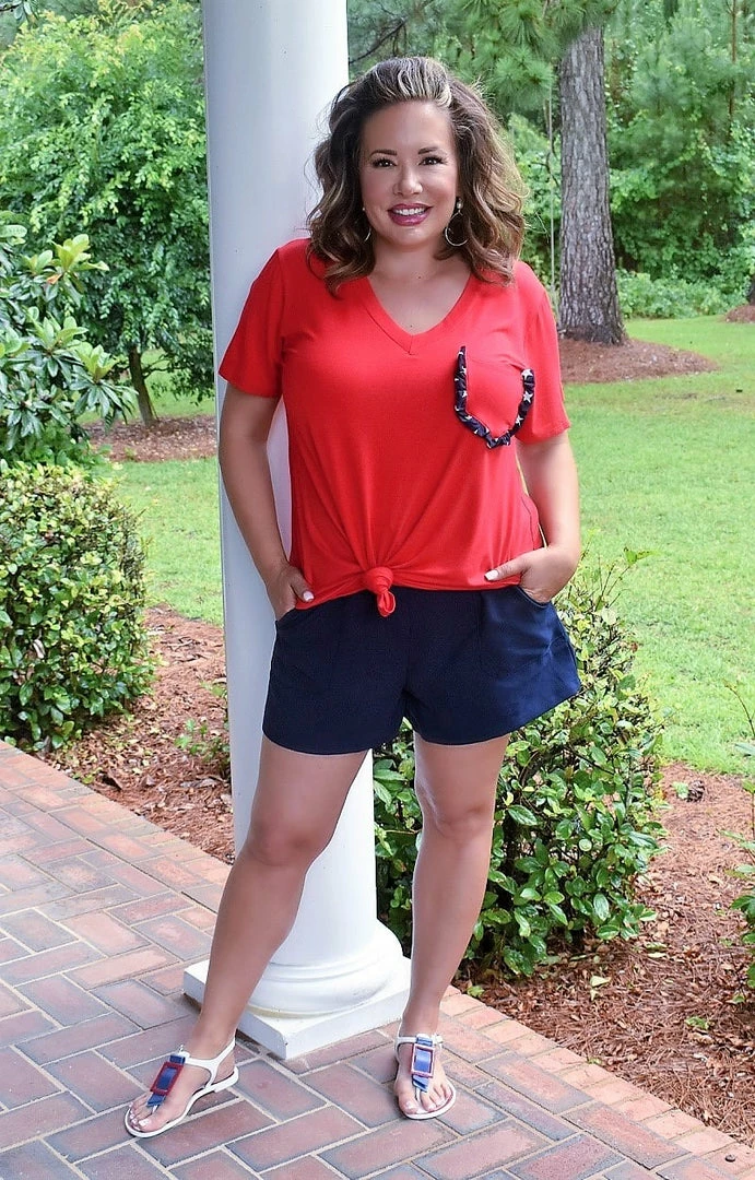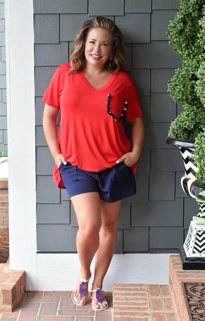 The cutest little go to top is here and calling your name this season! This one features a cute pocket design with star accents and ruffle to add such a cute pop. This one runs more open cut, so you could size down for a more cinched in fit. You are going to love this one the moment you put it on!