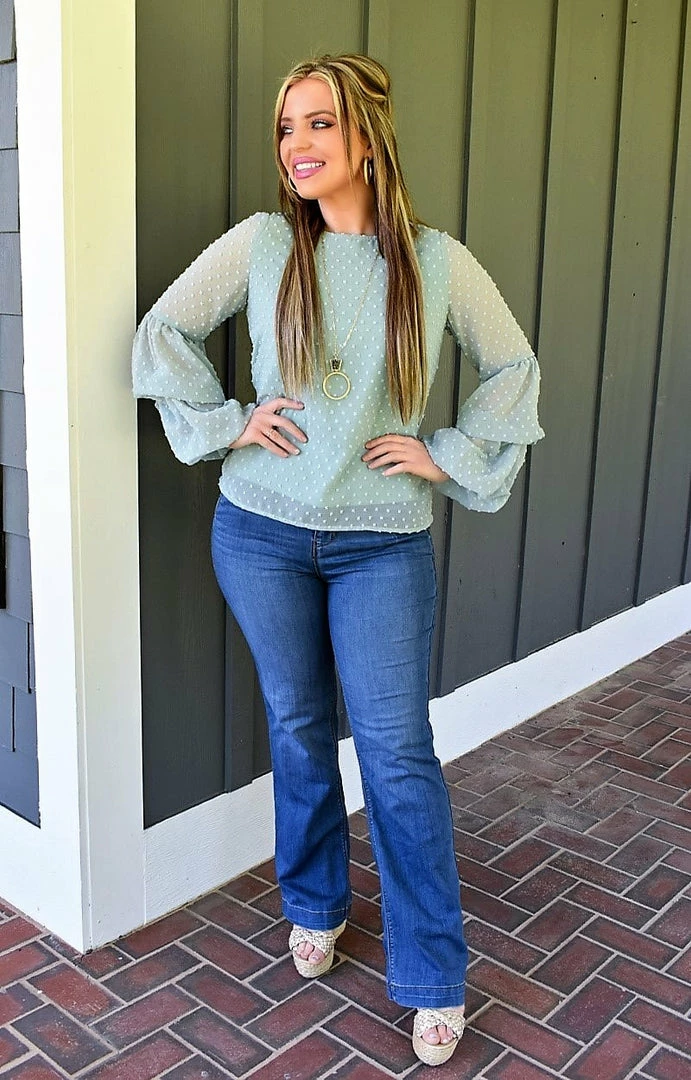 Obsessed is an understatement when it comes to this must have top! This top features a dust mint color with minky dot detailing throughout to give it that added touch of contrast. the sleeves have a fun design to bring on the drama as well. This one is lined underneath, with no stretch in the material. If larger in the bust area, we recommend going up one size. You are going to love this top!