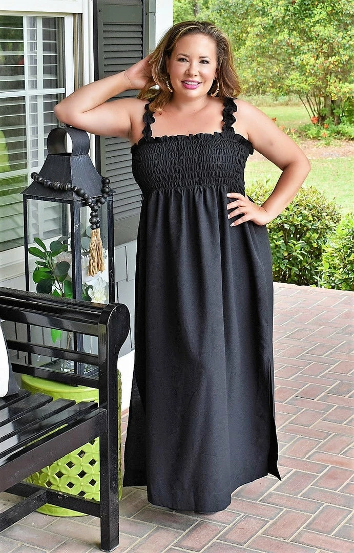 Every girl needs a little black dress in her closet and this maxi is just that! We love the solid black color making this great to mix and matching with endless shoes and accessories! The ruffled straps and ruched panel along the bust add accents we love! This dress is sure to be your new go-to, don’t miss out on making this maxi dress yours!