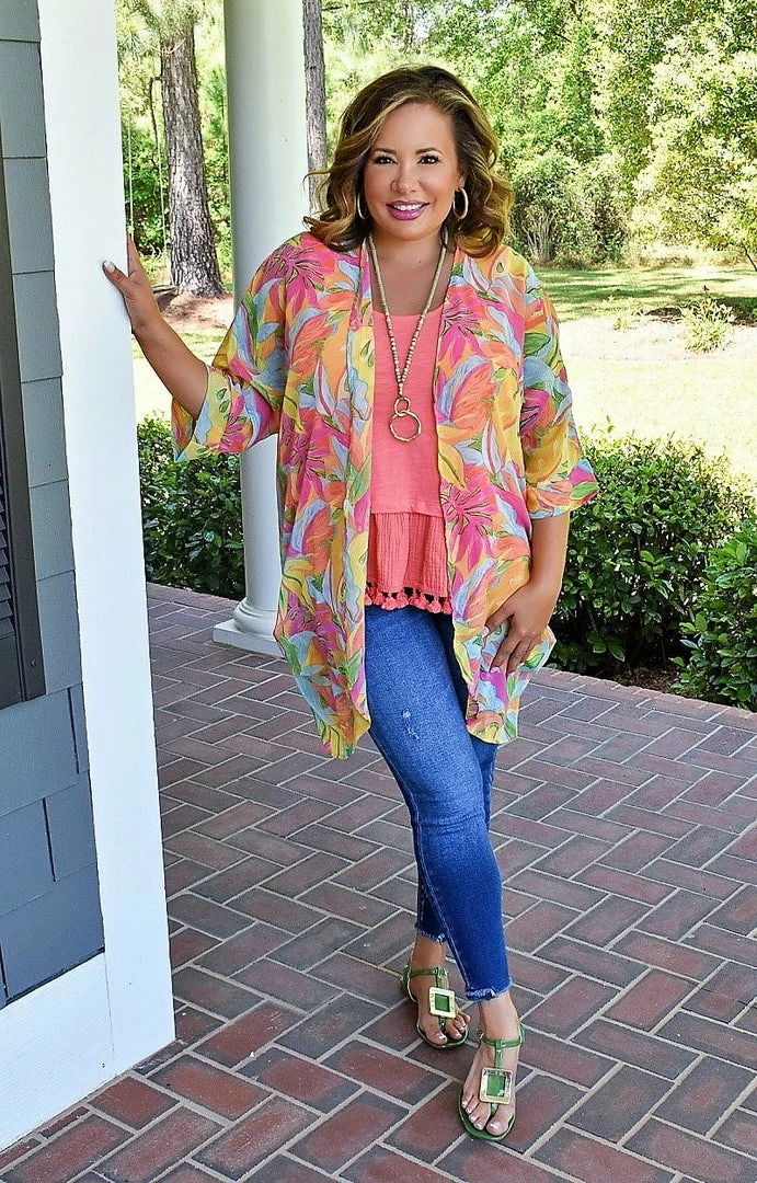 Layer in the most bold and stunning way this Summer with our fun print kimono! This kimono is full of color and vibrancy to make your outfit pop like no other. This one is breathable and lightweight with a more open cut for ultimate comfort. You are going to love rocking this with your favorite tops, dresses and even swimsuits this season!