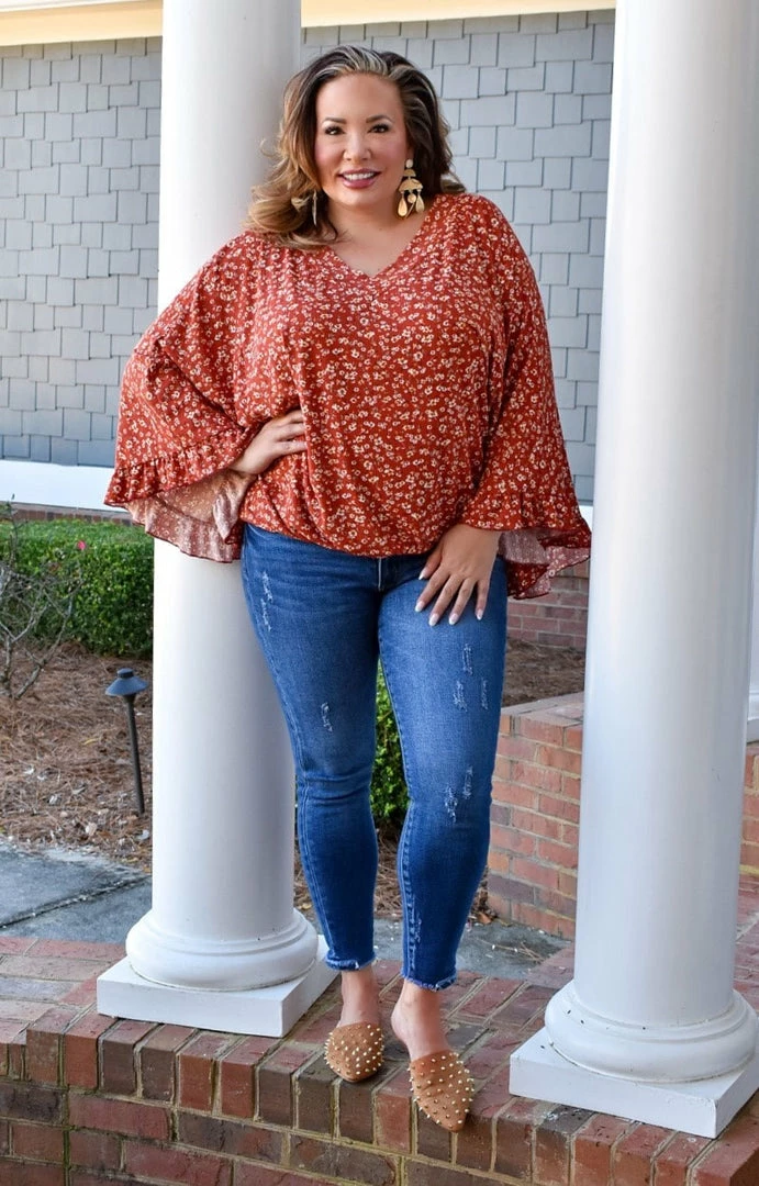 This floral top is absolutely adorable for your next go to look! It features a more relaxed and open cut design that glides over your shape to flatter. The sleeves have a more dramatic cut hat is sure to set you apart from the rest with ruffle accents. The dainty floral accents give this one a more girly pop. You need this one!