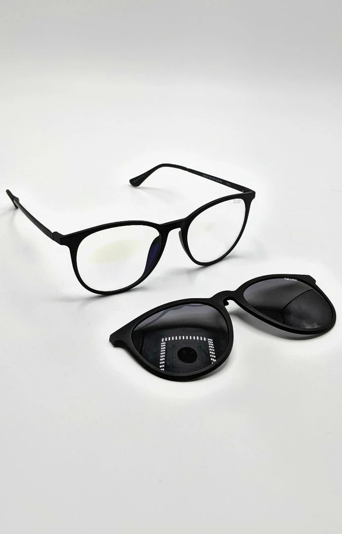 Twice as nice while you scroll or while you stroll. GREAT ESCAPE CLIP ON is a combo injection + metal-reinforced frame that gives you the best of both worlds—instantly turning blue light filtering glasses into polarized/polarized sunnies in a snap. The injection clip-on features small magnets, so it stays nice and snug.