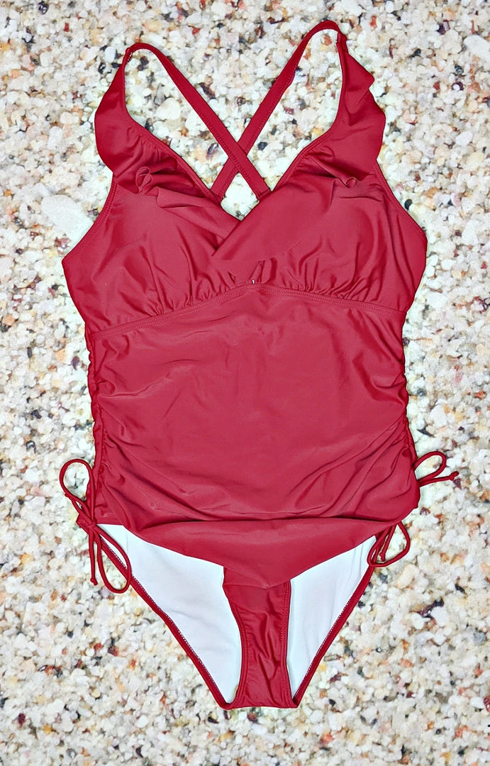 This little red swimsuit is just what you need to turn heads all season while keeping a more modest look. This one features a plunging neckline with ruffle accents to add a pop. The ruched detailing along the sides with the ties also adds an extra touch of style. You are going to love this one!
