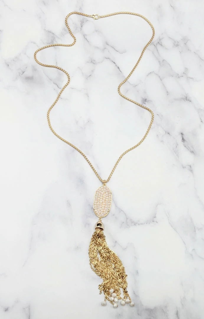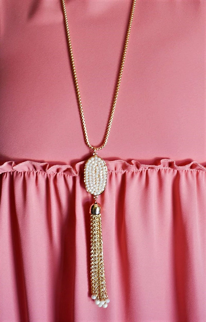 This stunning statement necklace has us completely obsessed! We love the gold chain design with the beaded pendant and tasseled trim truly setting this necklace apart from the rest! Hurry and make this stunning necklace yours!