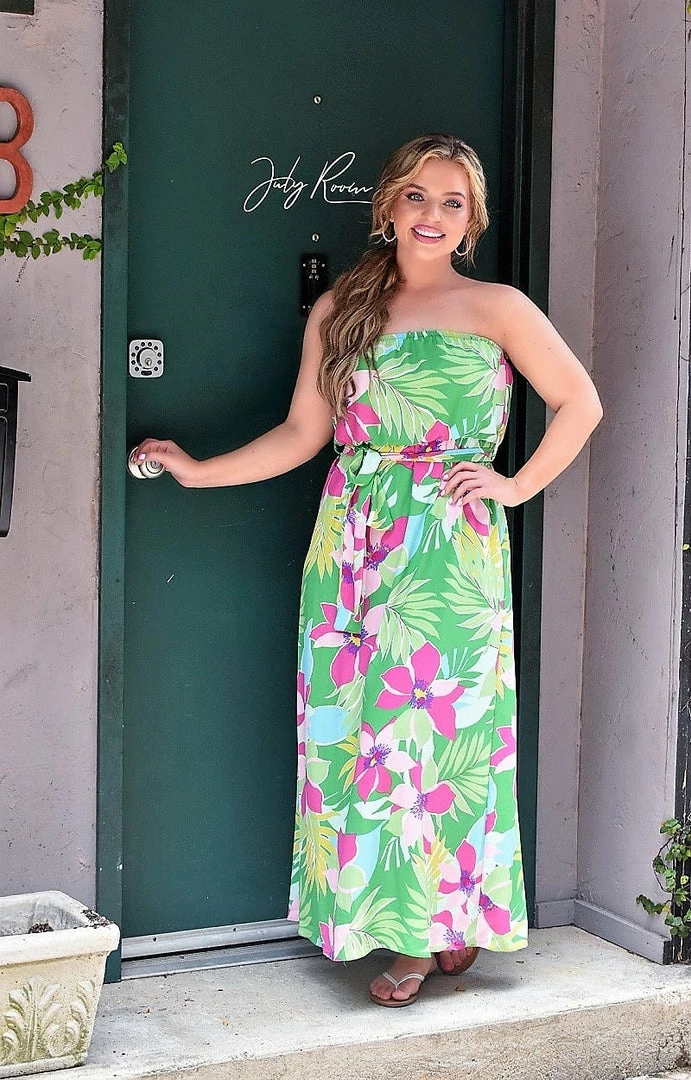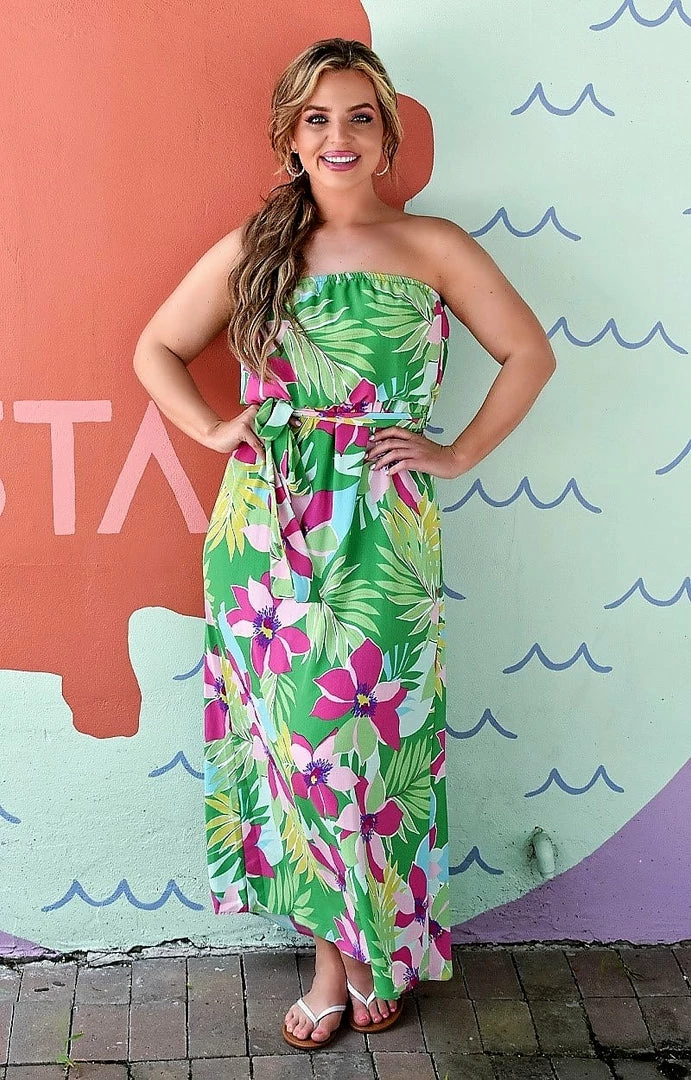 This dress has summer written all over it! We love the green base with the tropical floral print sure to have you ready for your upcoming summer vacations. This features a strapless design and is cinched in at the waist with a belted tie. We love how this dress effortlessly flows for a figure flattering look. Be sure to make this eye catching maxi dress yours!