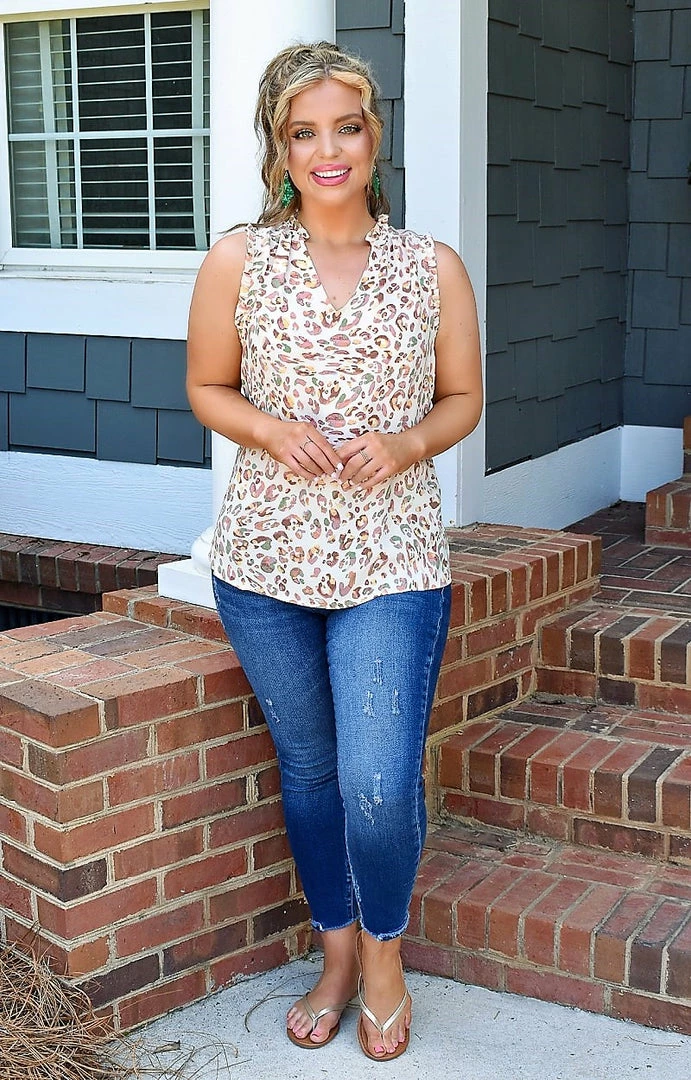 This leopard print top is sure to be one of your favorite everyday must haves! It features a non stretch material, but does run very true to size. The fun colors throughout are perfect for Summer to add a pop. Throw this on with your favorite jeans and get ready to turn heads all day!