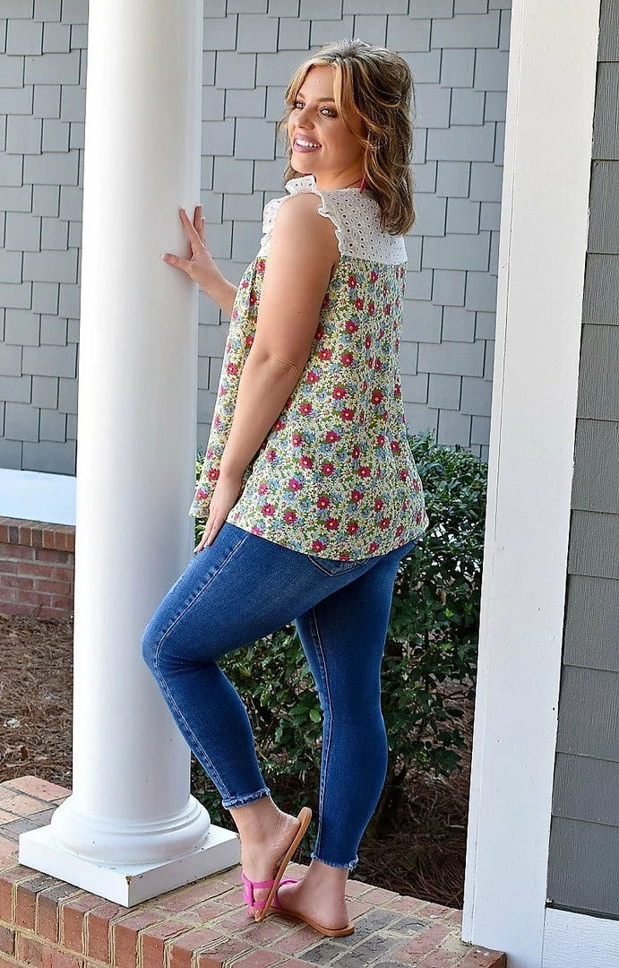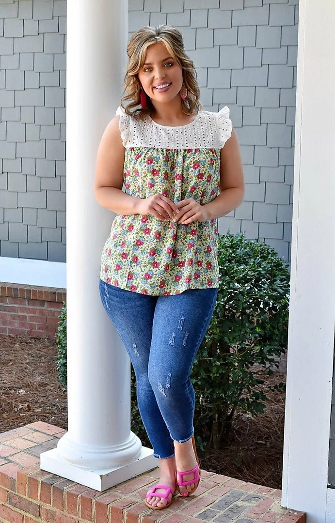 We are smitten by this eye catching little floral print top! This one features a bold array of colors that are sure to make your look pop this Spring/Summer! There is no stretch in the overall material, but it does glide over your shape with a flowing fit to flatter. The top features eyelet detailing with a ruffle design along the shoulders to give it that girly pop. Grab yours and take your casual to the ultimate level of fab this season!