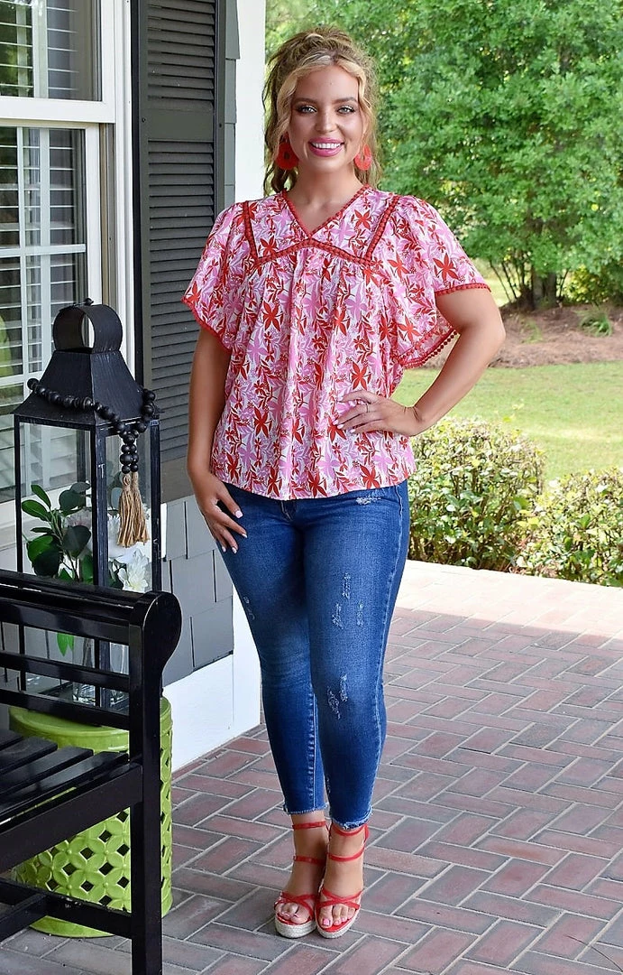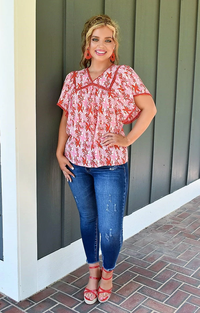 There is so much to love about this vibrant red and pink floral top! This stunner runs true to size with no stretch to the overall material. We love the rivet embroidered details lining the neckline and trim of the sleeves adding such a fun flare! Make this must have yours and enjoy all eyes on you!