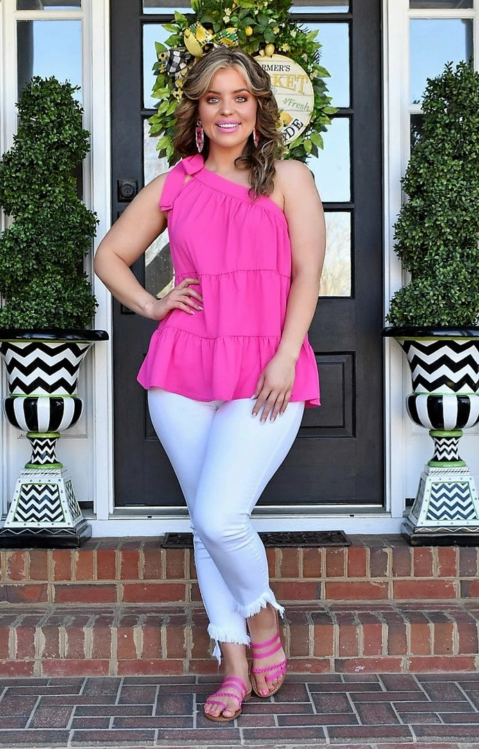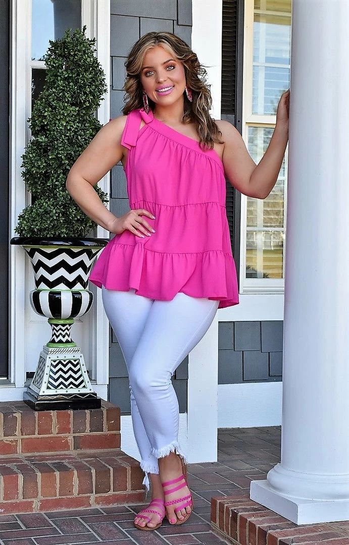 This classy little top is simple, yet totally eye catching. Made in a bold fuchsia color, it features a one shoulder design that ties along the neckline to add an extra pop of flare. There is no stretch in the overall material, but it does run true to size with a flowing, more open cut. Grab yours before it’s gone!