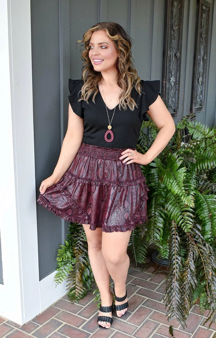 Calling all sassy girls! Bring on the bold edgy pop to your look with this fabulous print skirt! This one features a snake print pattern with a vibrant wine background that looks amazing with our black bodysuit! This one has a stretchy ruched design along the waist to truly cinch you in with the cutest ruffle accents throughout to dress it up. Grab yours before it’s gone!