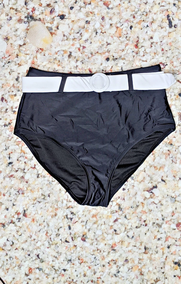 There’s more to sea, gals! Secure your pin-up silhouette to these fabulous swim bottoms, and take a stroll on the pleasure pier. Featuring a jet black color throughout the high waisted design, this adorable swim separate boasts a stunning white belt to flatter your posing. Fully mesh lined for resort wear, it’s a fabulous addition to the seaside ambiance!