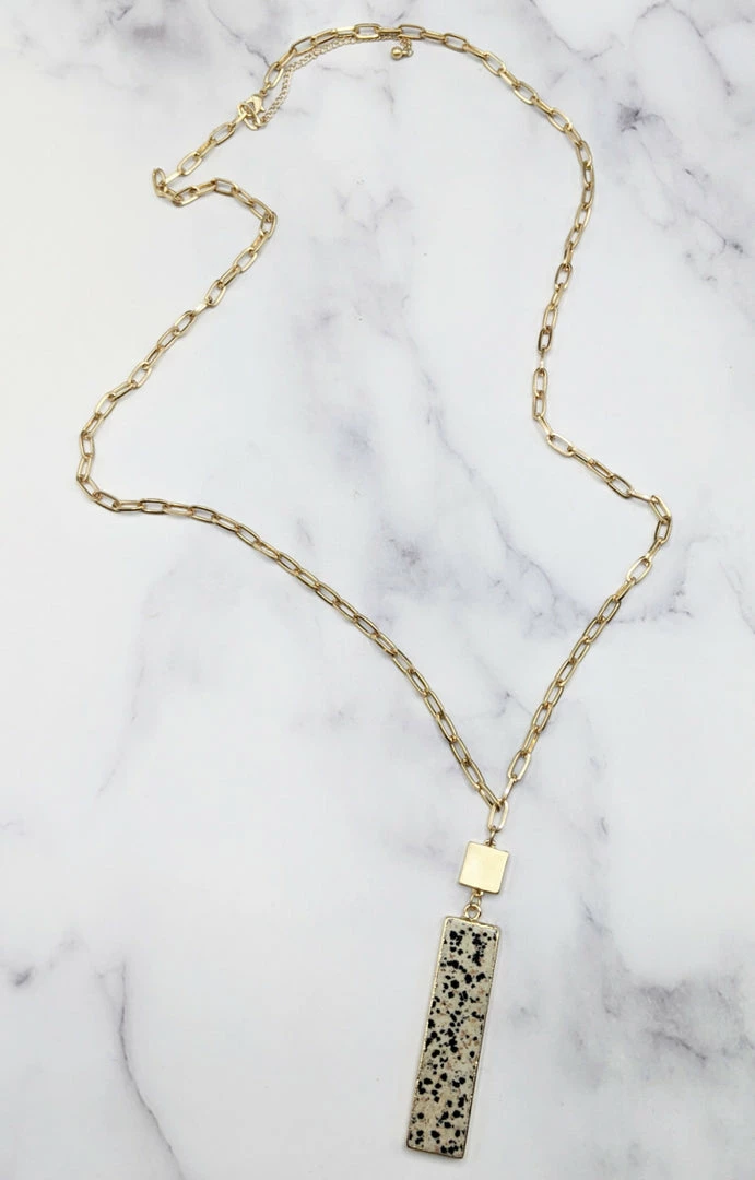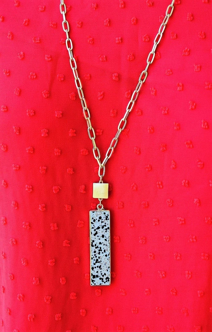 The cutest necklace ever is here and begging to be added to your accessories! We love the unique rectangle pendant shape with the natural dotted finish truly giving this necklace a look like no other! Make this yours and enjoy the endless styling options!