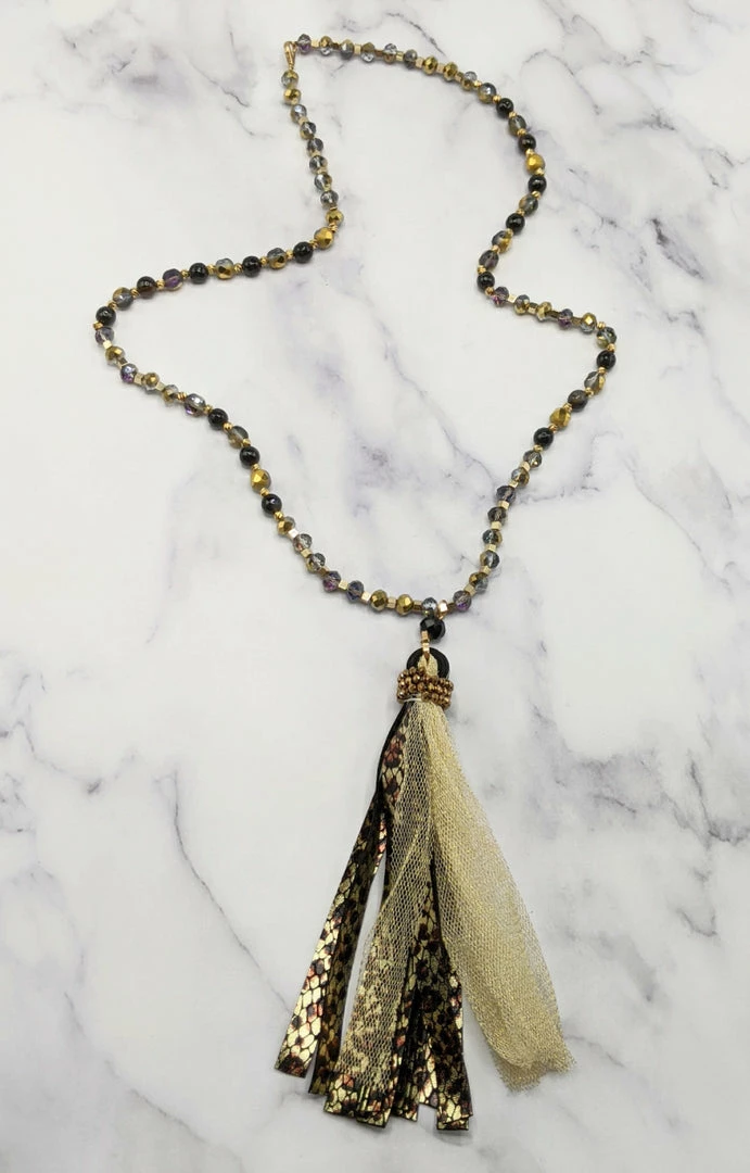 You are going to be obsessed with this stunning necklace! We love the gorgeous beaded design with the snake print tassel and tulle accents throughout. You will love the endless pairing option this must have offers!